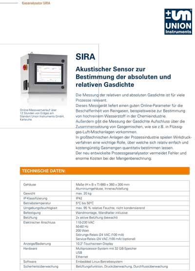 Der Prozessgasanalysator SIRA ist das Standardgerät zur Online-Bestimmung der absoluten und relativen Gasdichte, welche mithilfe einer akustischen Dichtezelle ermittelt wird.